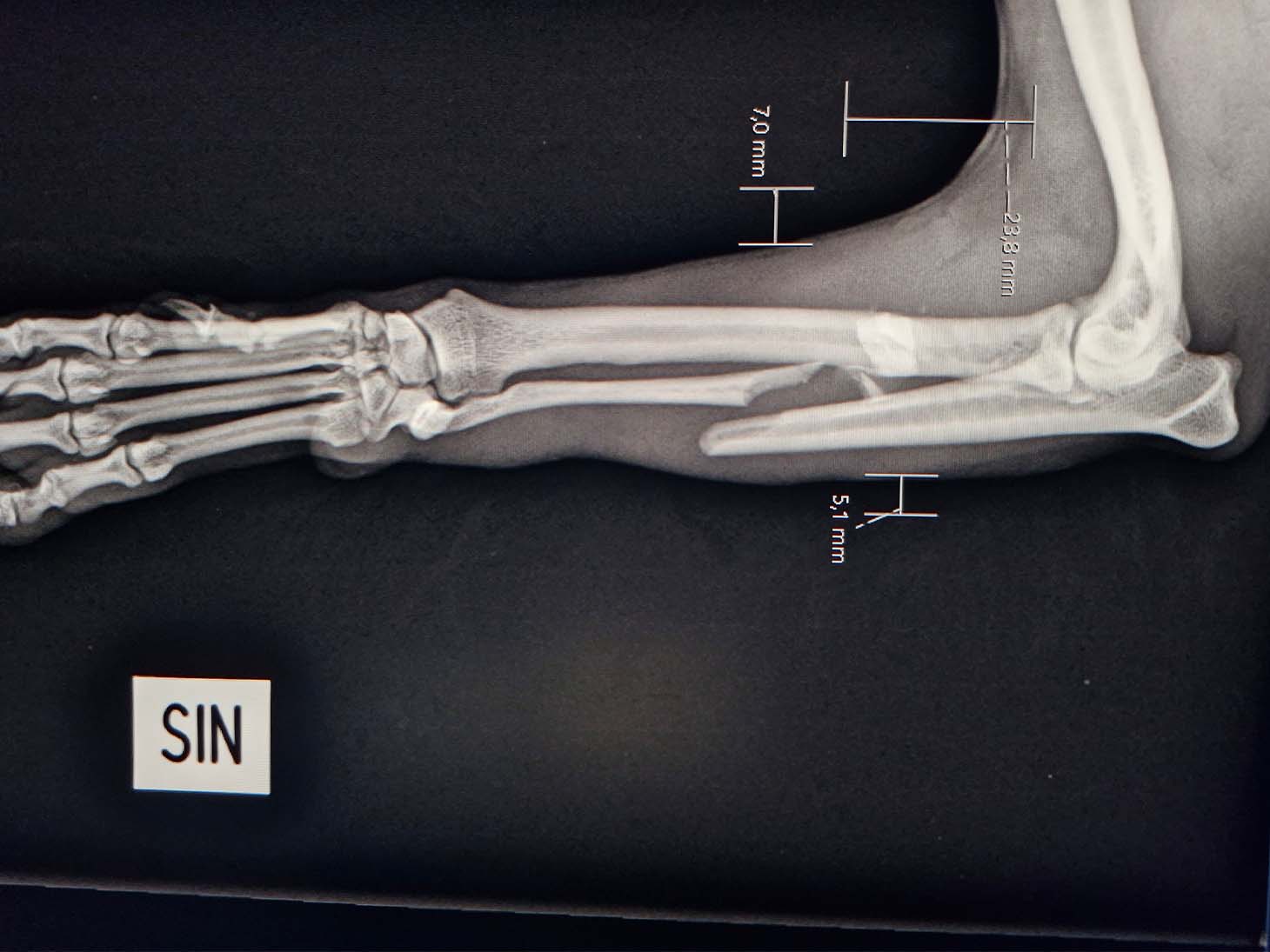- The severely comminuted radius fracture was stabilized using a 2.0 mm titanium LeiLOX plate, specifically chosen to manage the comminution in combination with a supportive repair of the ulna.