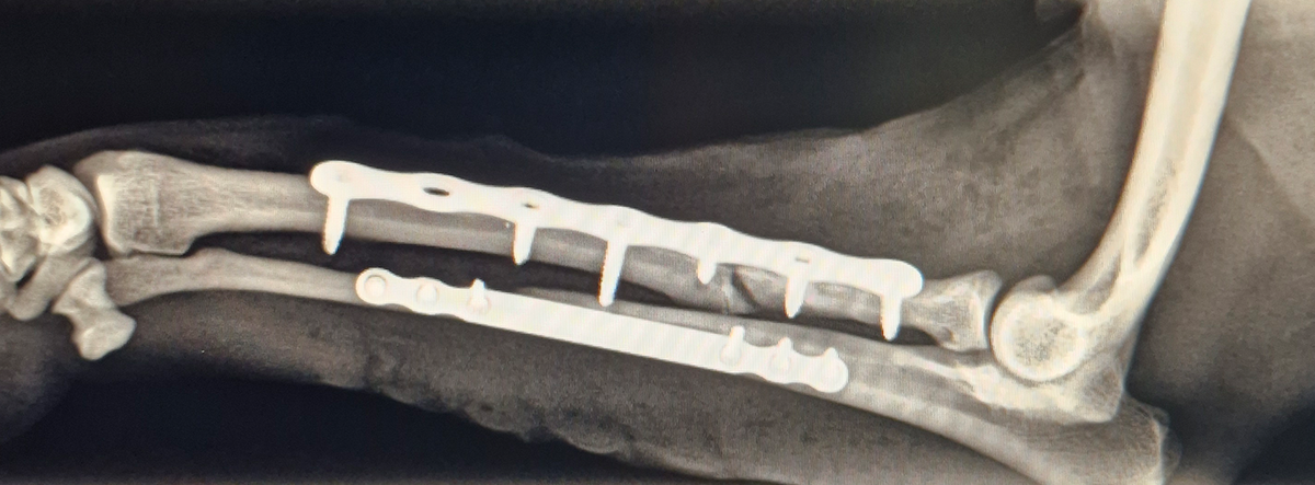The surgery was completed without complications. Postoperative radiographs confirmed anatomical alignment and stable fixation. With careful rehabilitation, the young Yorkshire Terrier is expected to regain full function and resume normal activity pain-free.